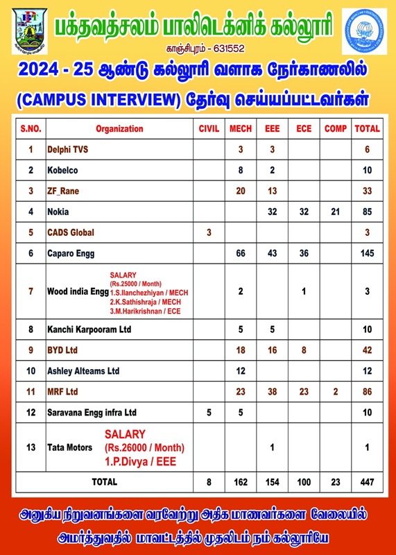 The Bhaktavatsalam Educational Trust with Thiru.O.V.Alagesan, a great patriot and an ardent follower of Gandhian Ideals as its Founder President established the Bhaktavatsalam Polytechnic, now rechristined as BPT.